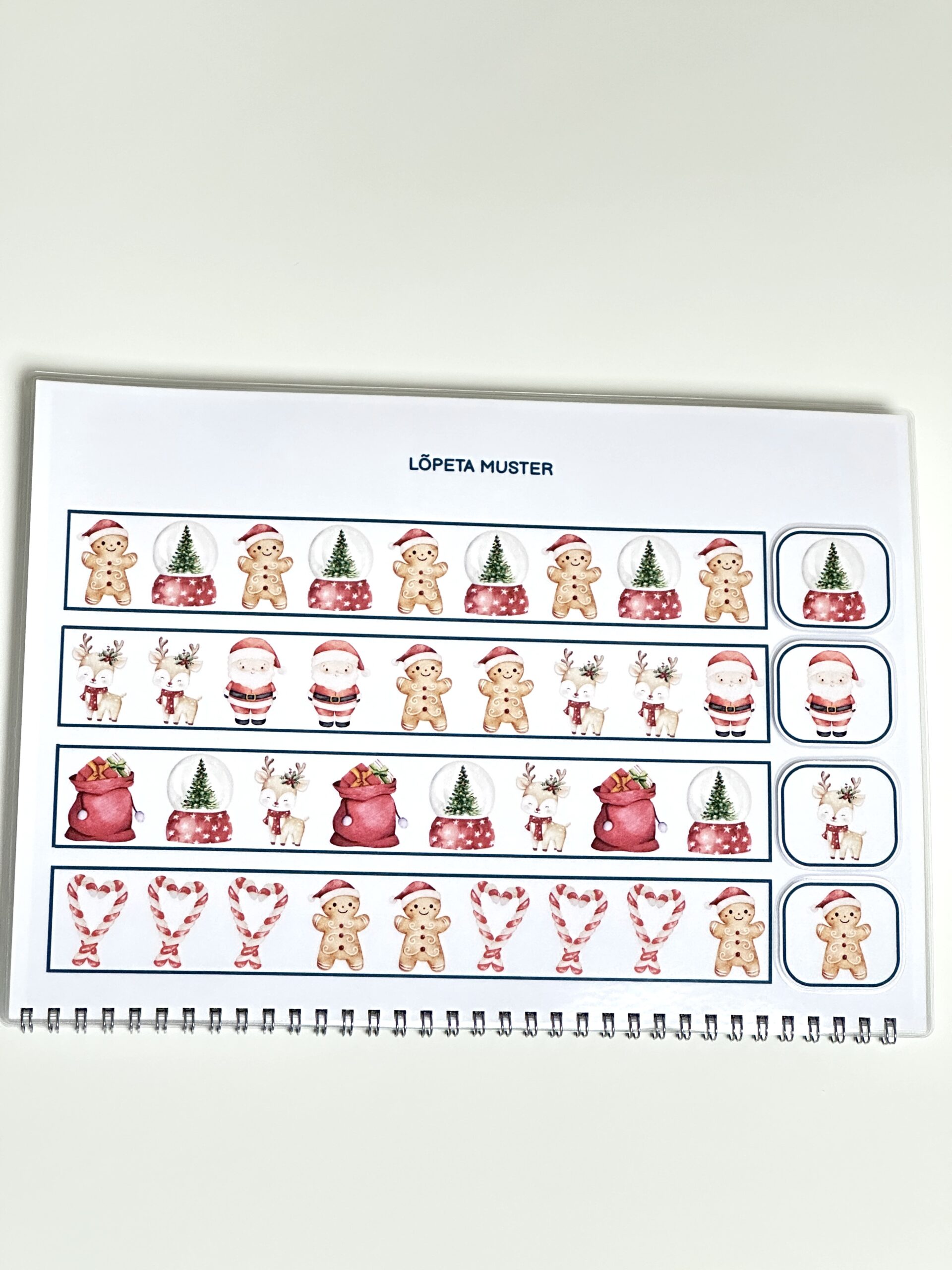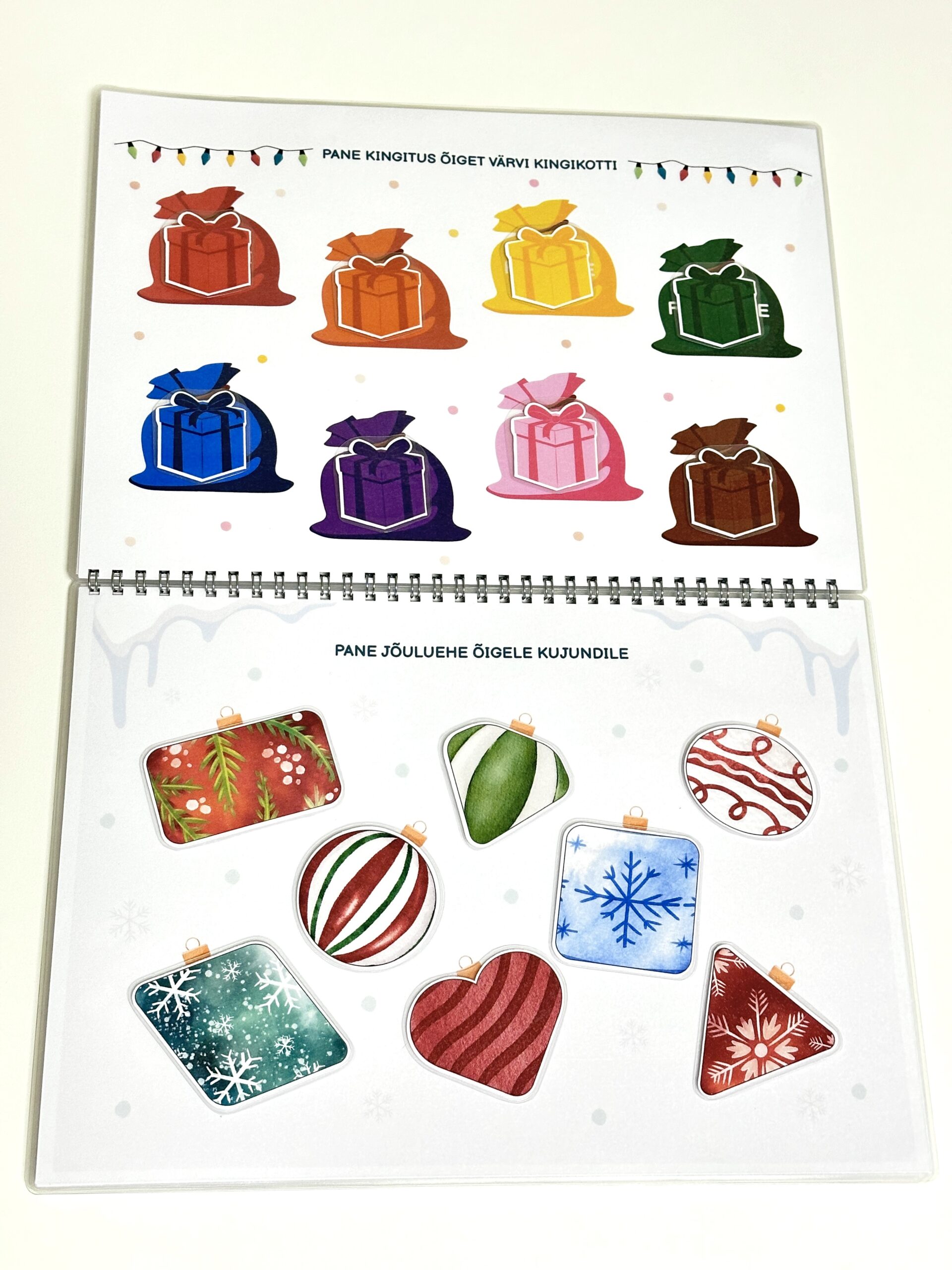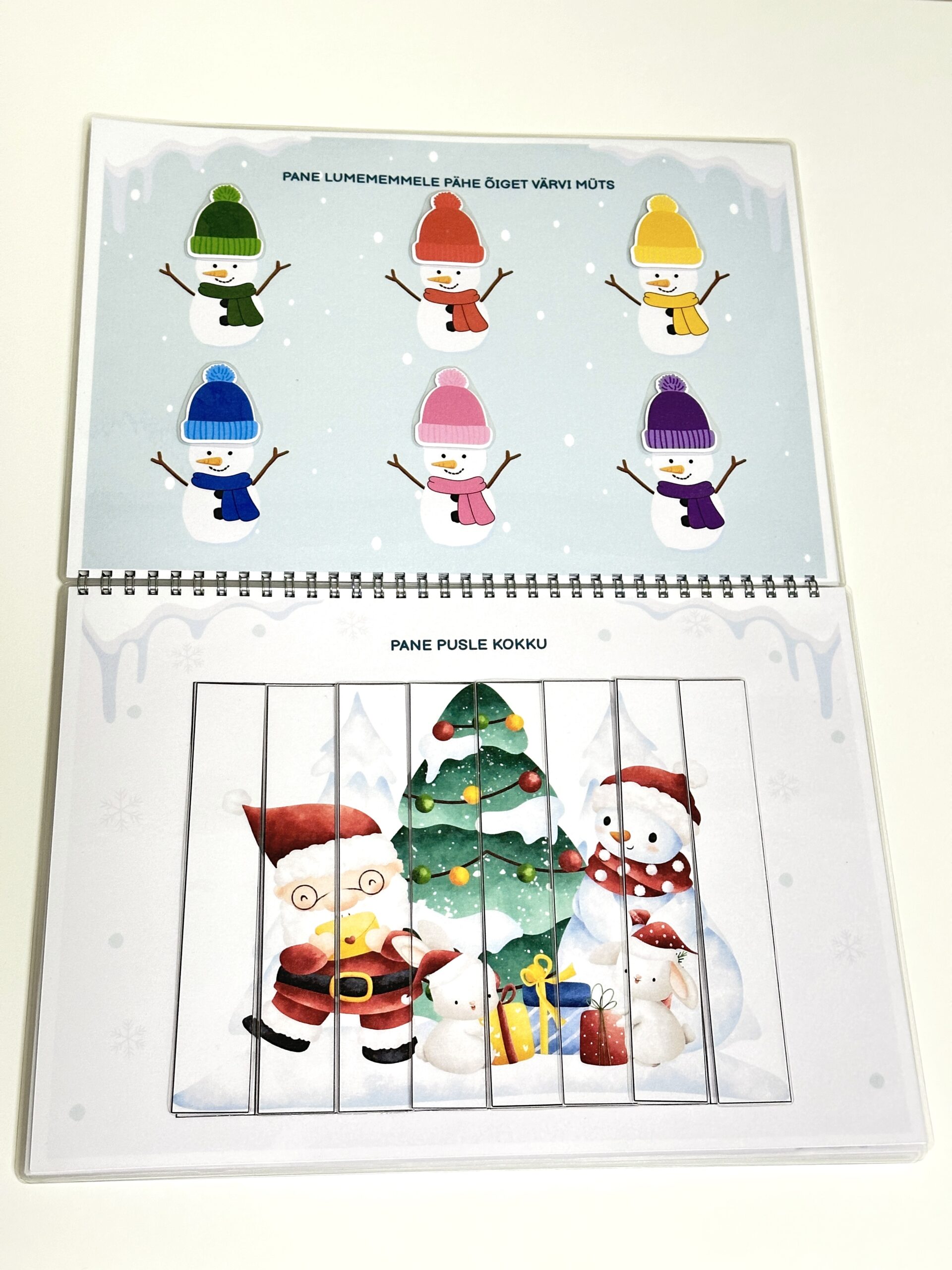 Jõuluteemaline Nuputamisvihik, kus on 14 (A4) lehekülge erinevaid ülesandeid – paaride ühendamist, varjude leidmist, puuduvate osade otsimist, jõuluvana meisterdamist, kuuse ehtimist, loendamist ja palju muud.