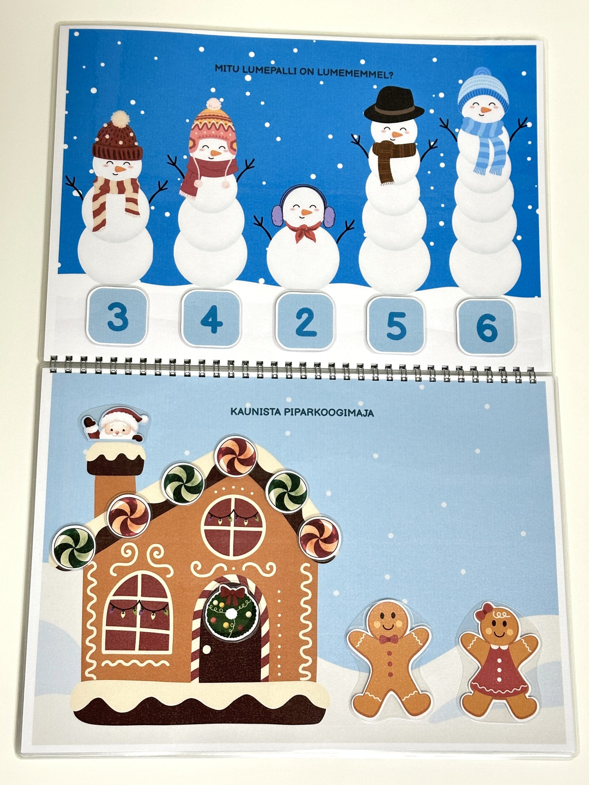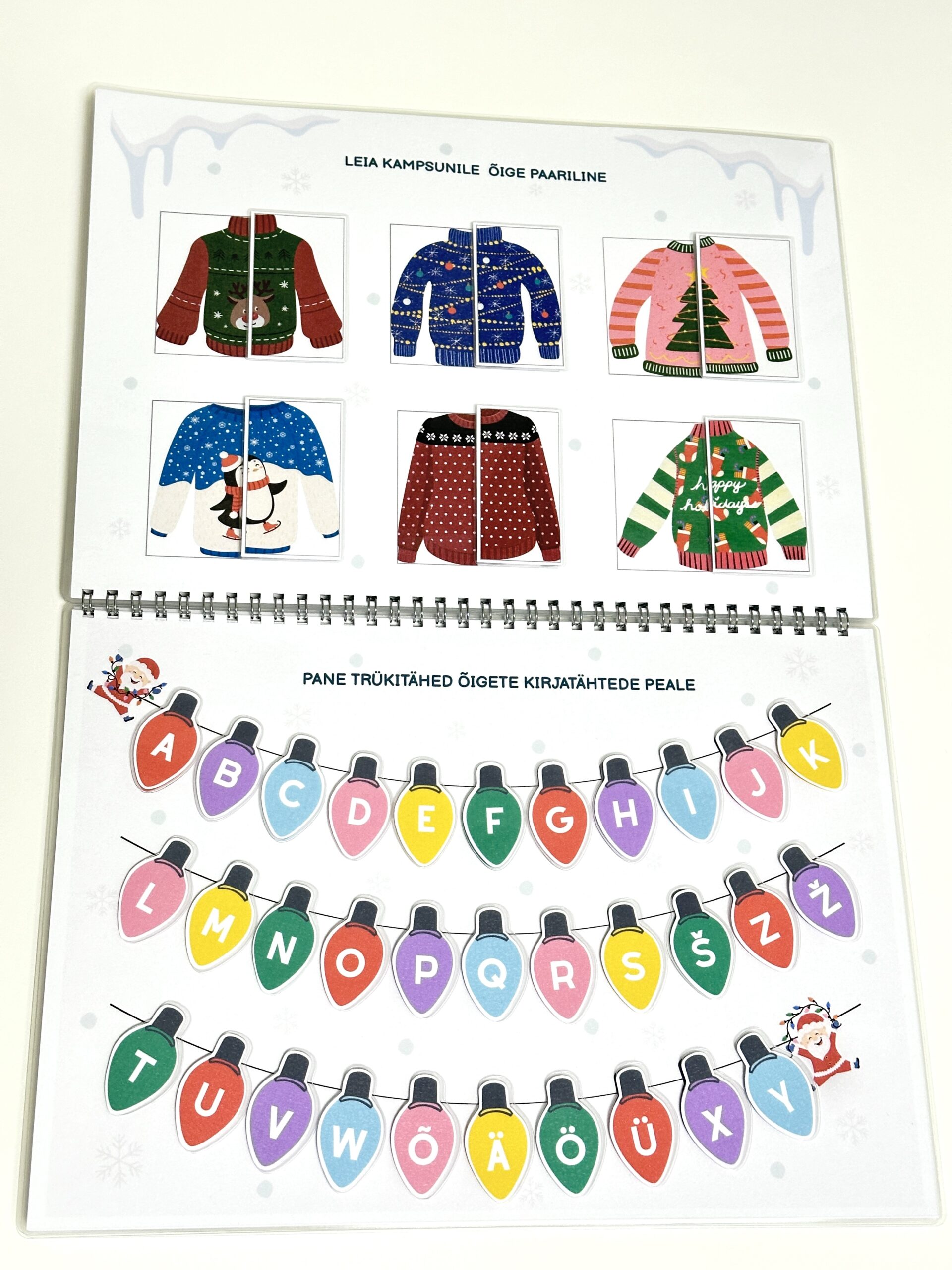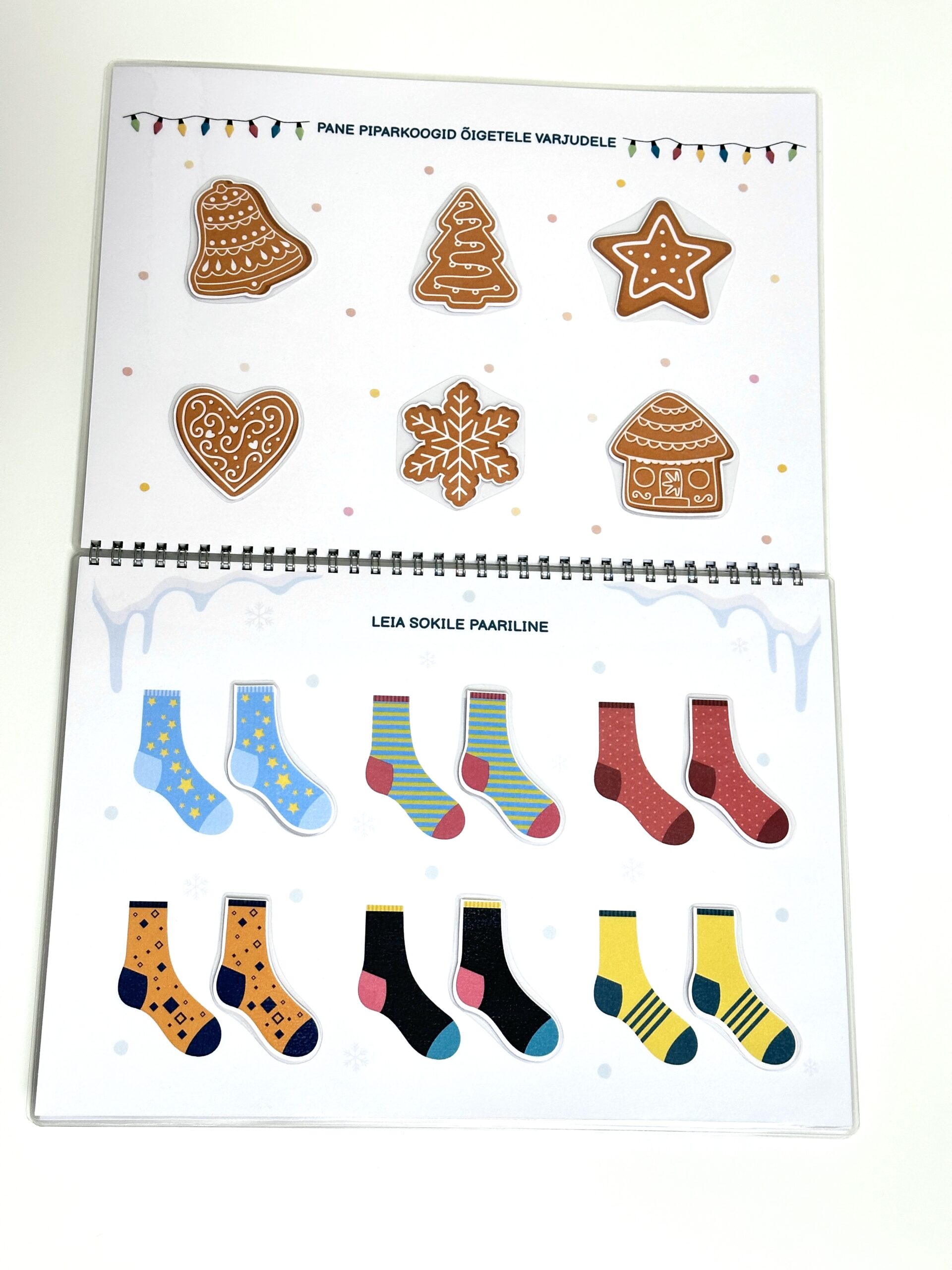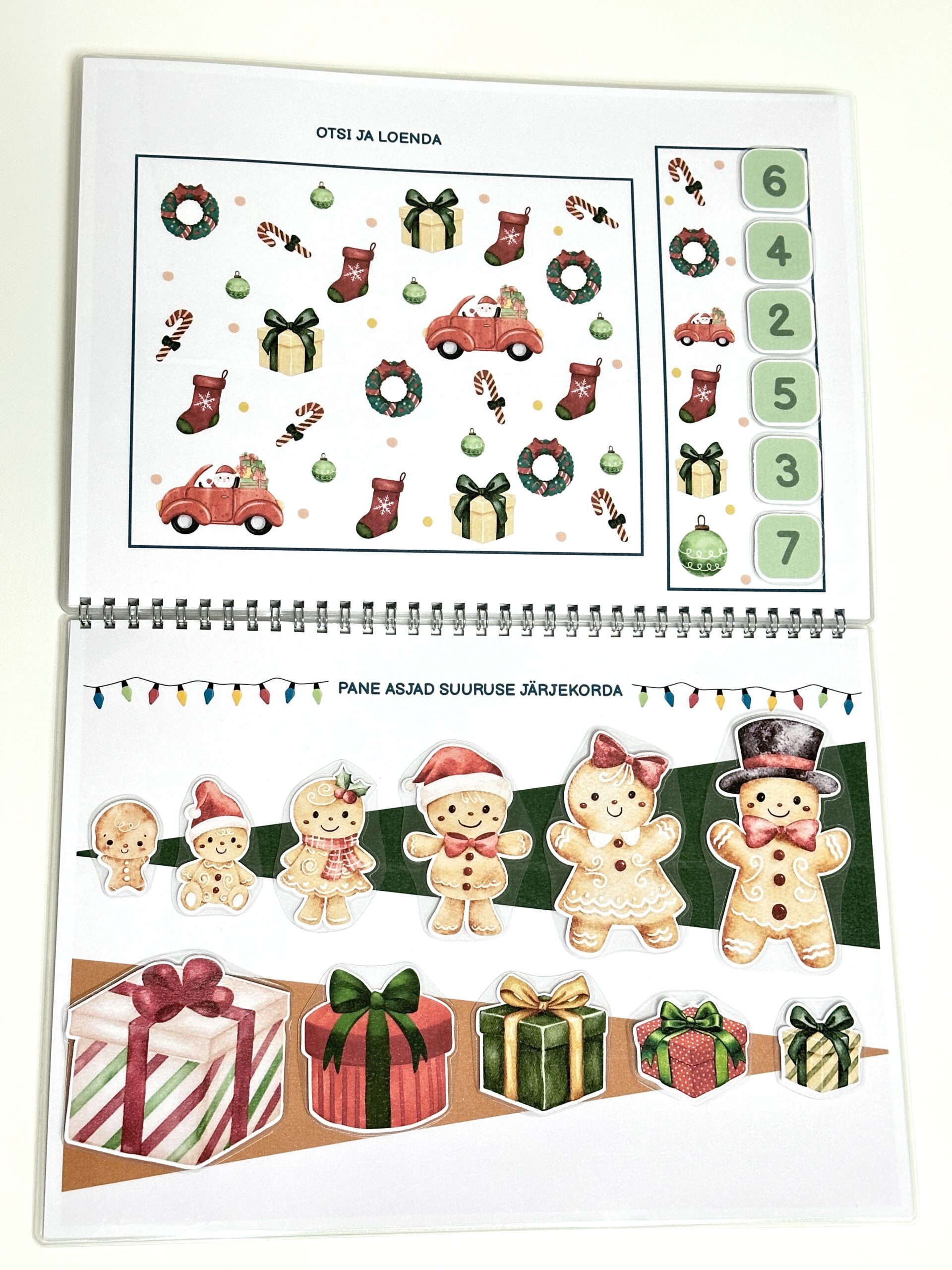 Jõuluteemaline Nuputamisvihik, kus on 14 (A4) lehekülge erinevaid ülesandeid – paaride ühendamist, varjude leidmist, puuduvate osade otsimist, jõuluvana meisterdamist, kuuse ehtimist, loendamist ja palju muud.