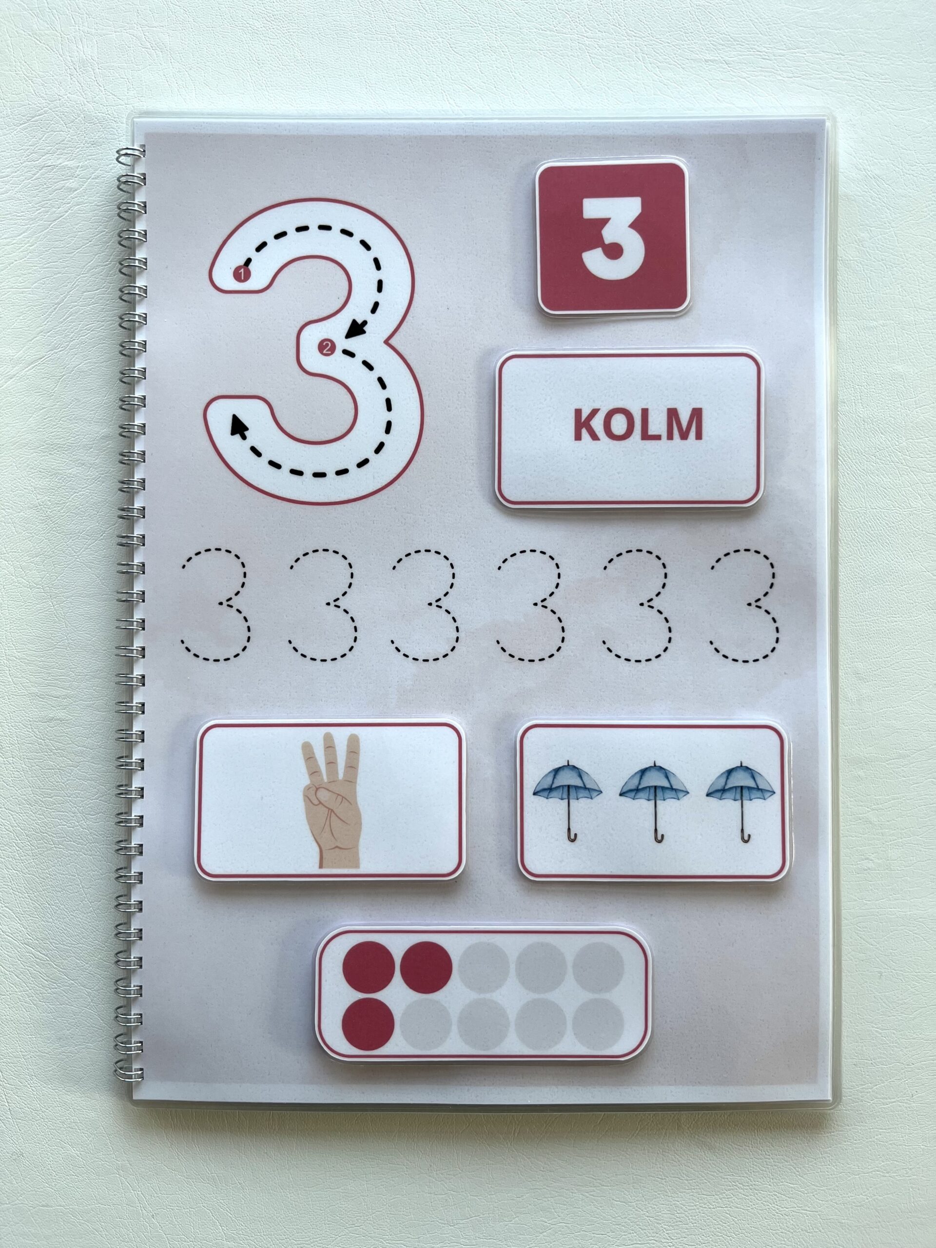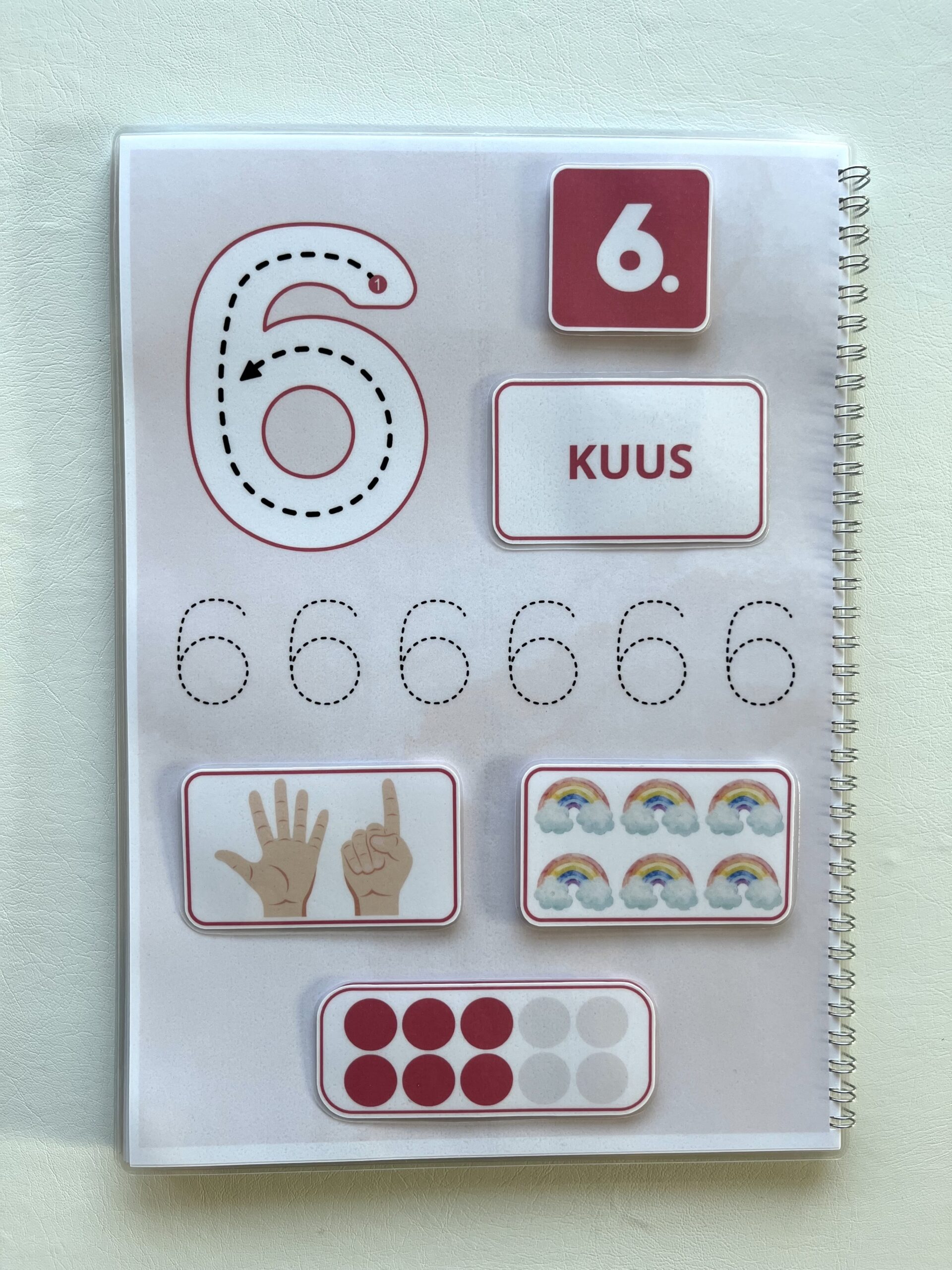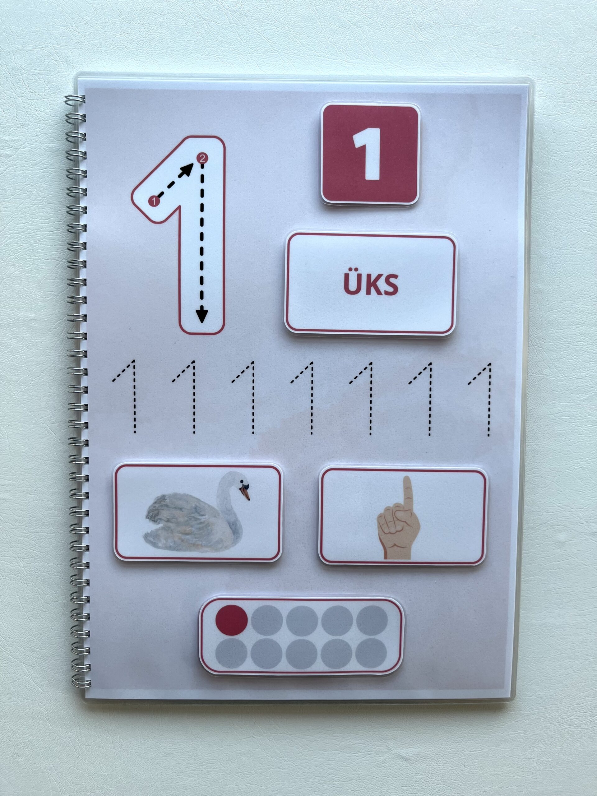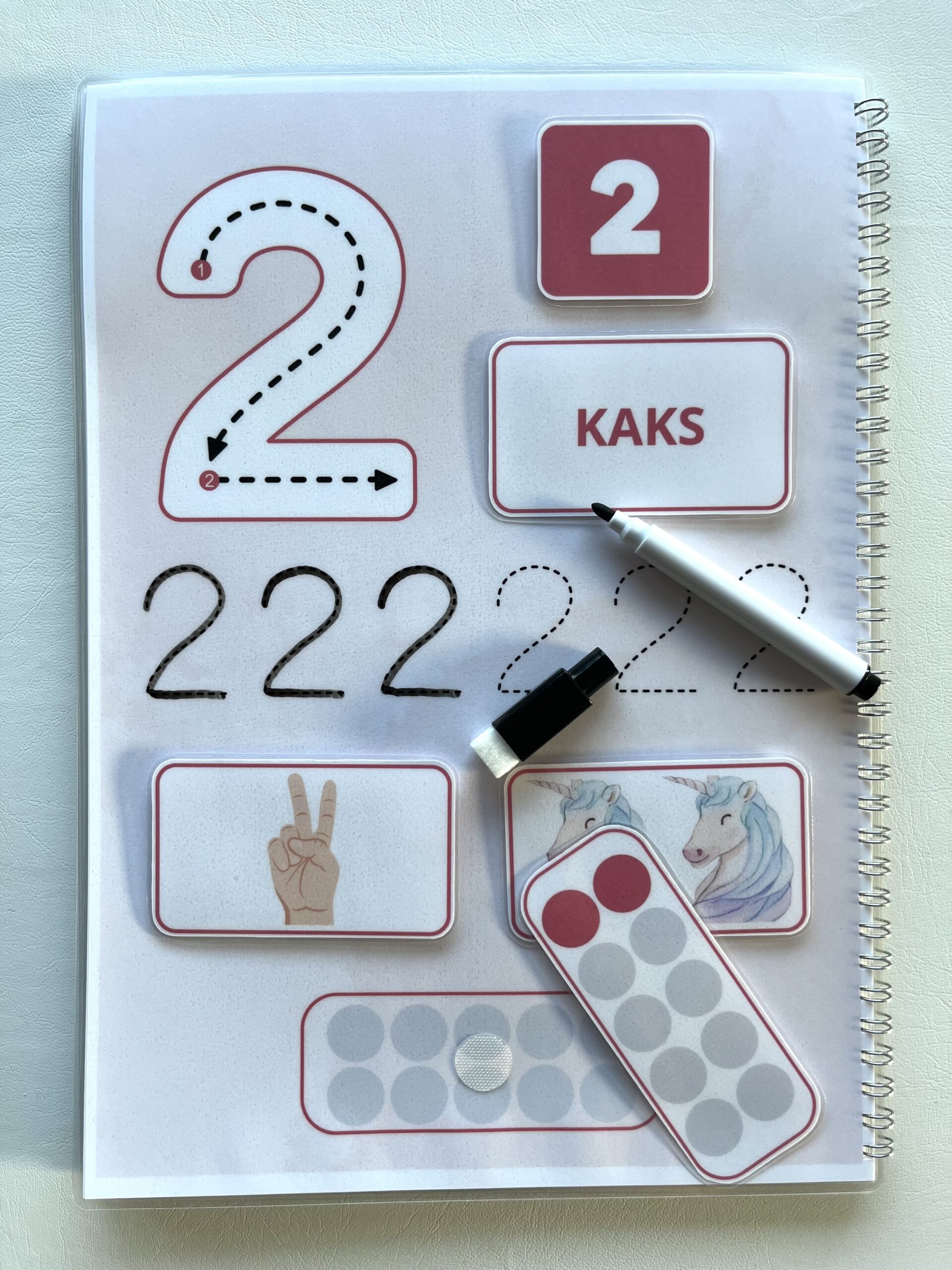 Lisaks saab punktiirjoone abil õppida numbrite kirjutamist kaasasoleva markeriga (markerit saab kergelt kustutada ja taas kasutada).