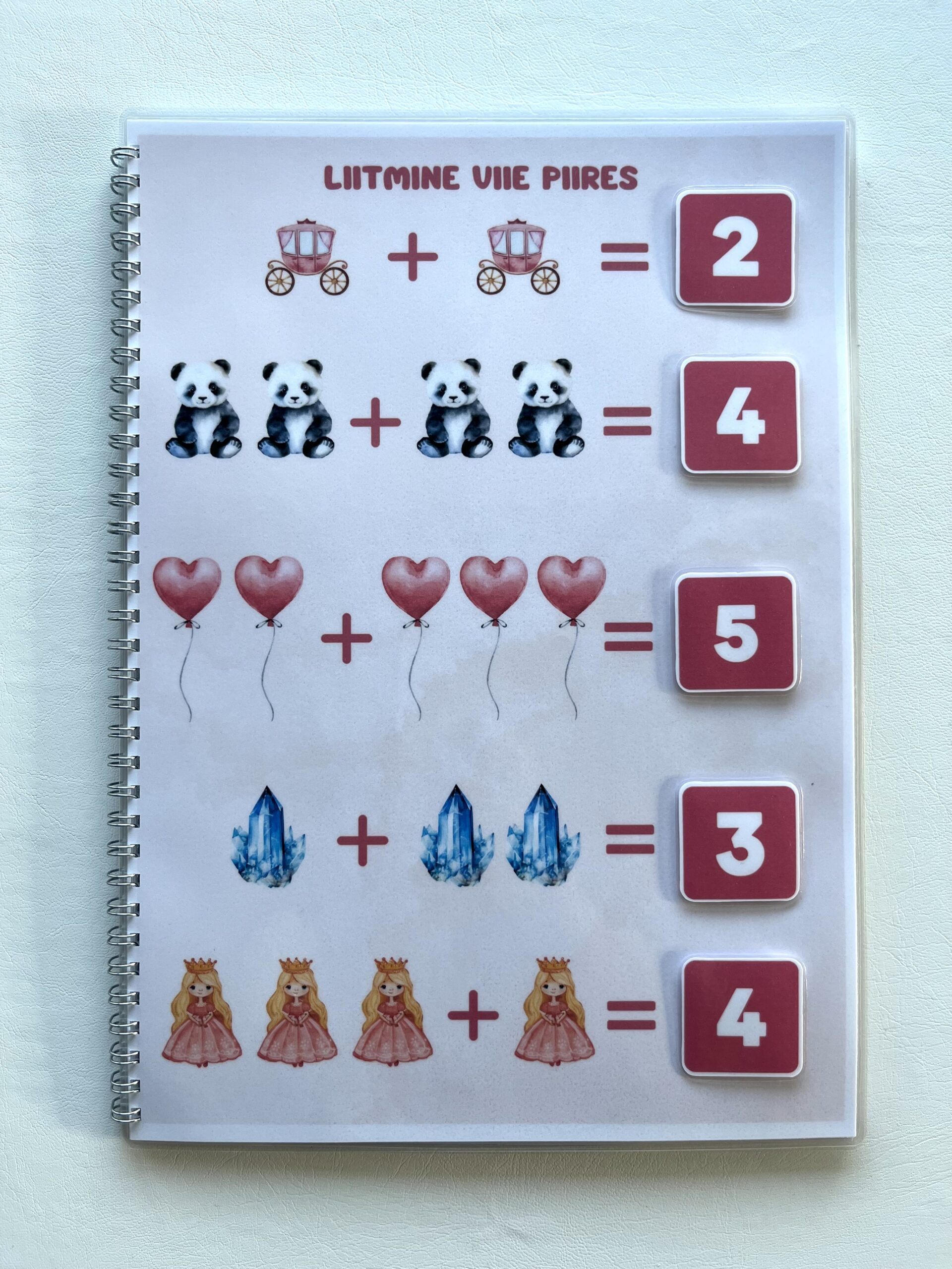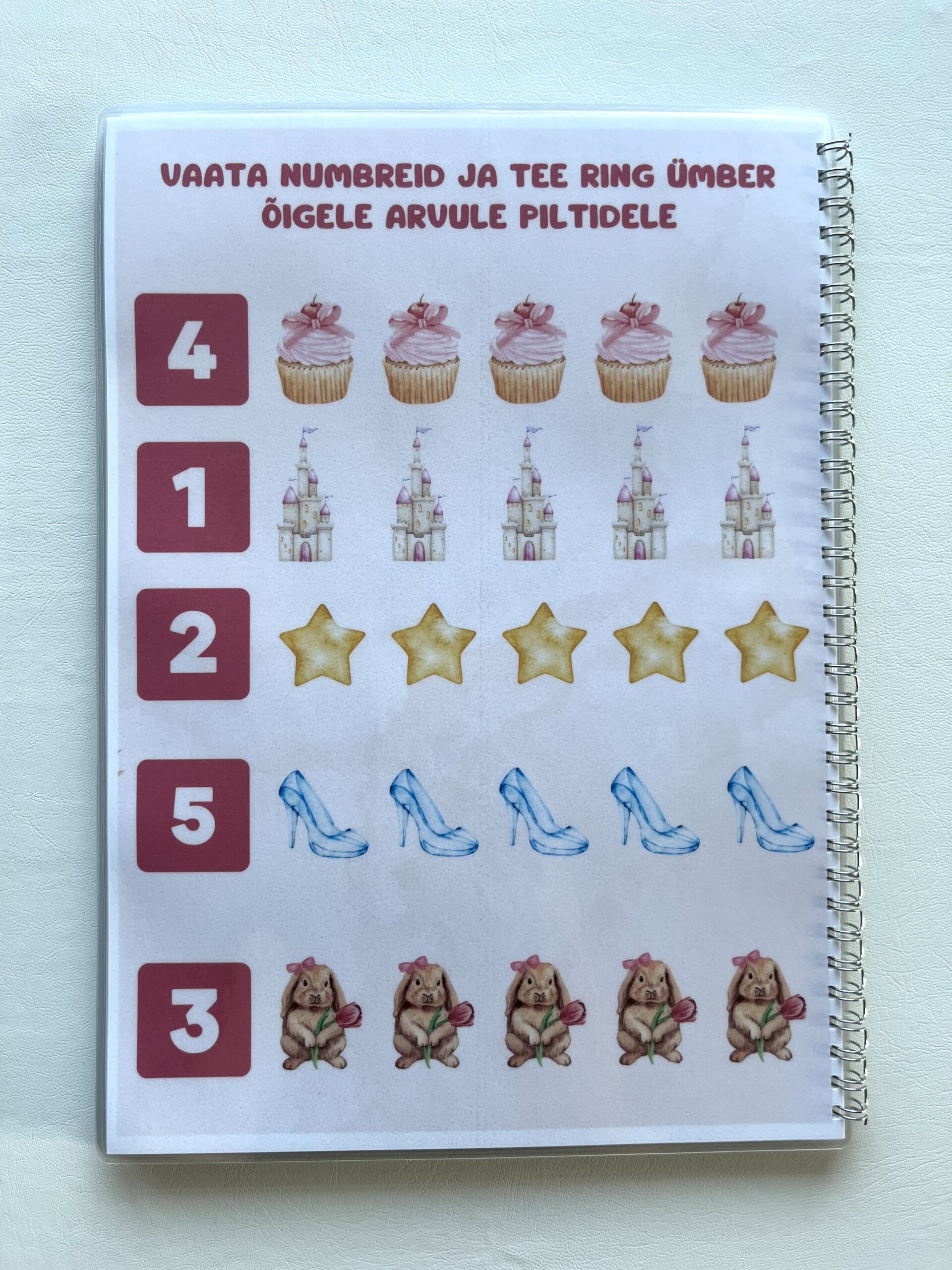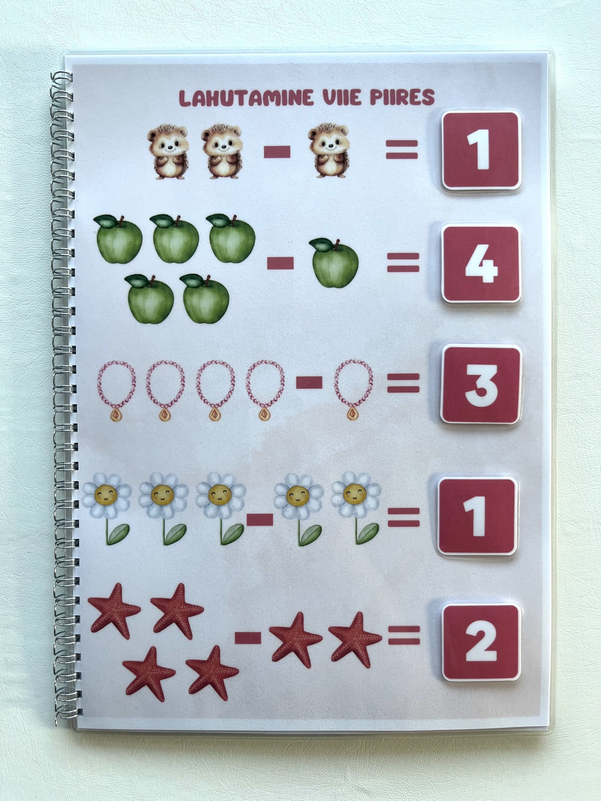 Laps saab pildid kinnitada takjakinnitustega õigete numbrite juurde. Õpib trükitähtedega kirjutatult sõnu, sõrmedelt numbreid lugema või hoopis loendab piltidel olevaid asju.