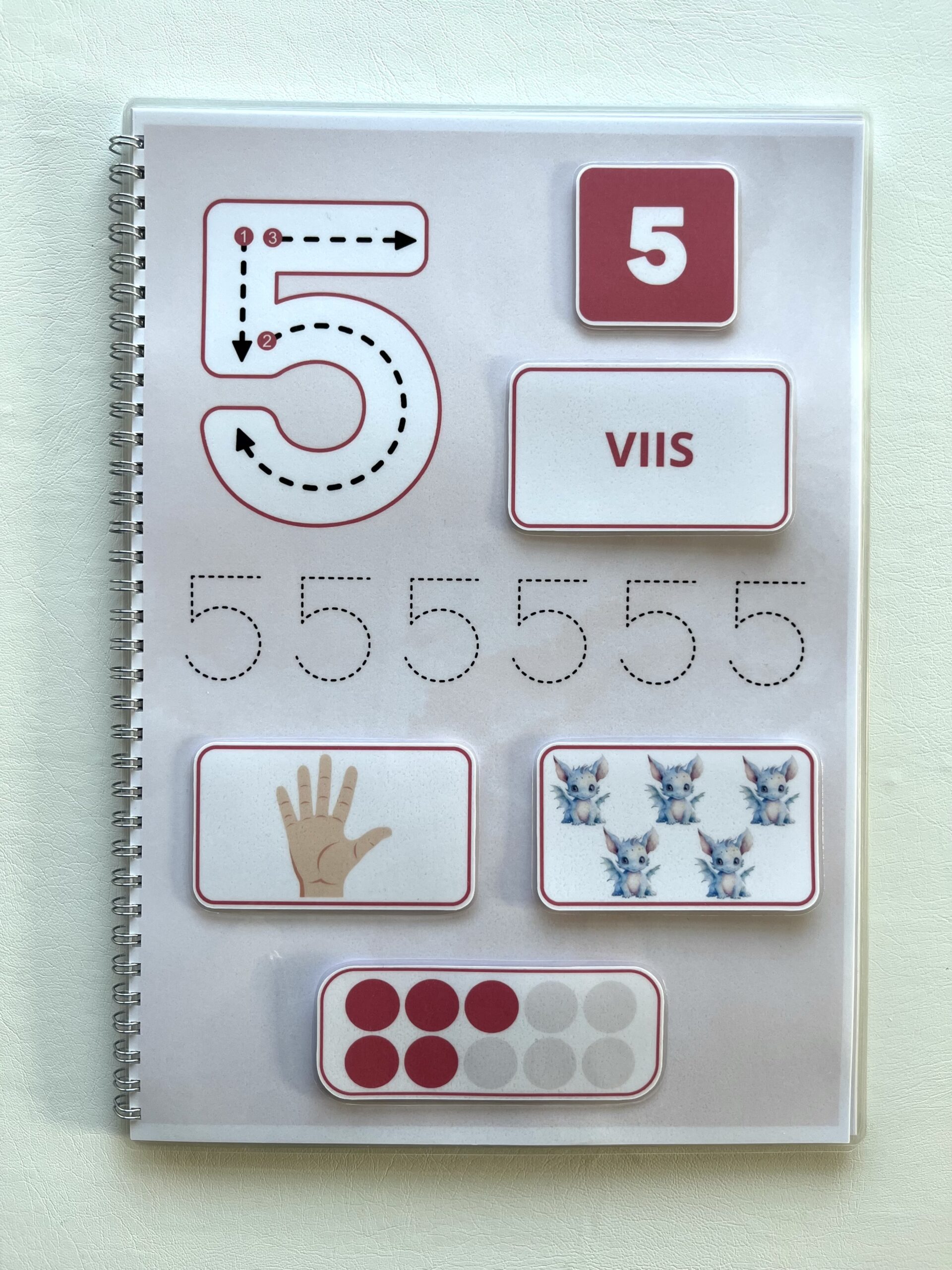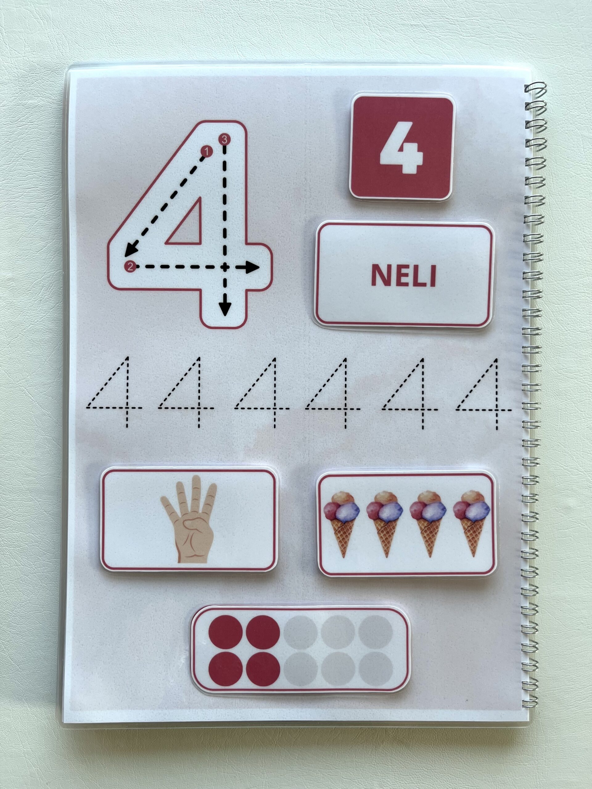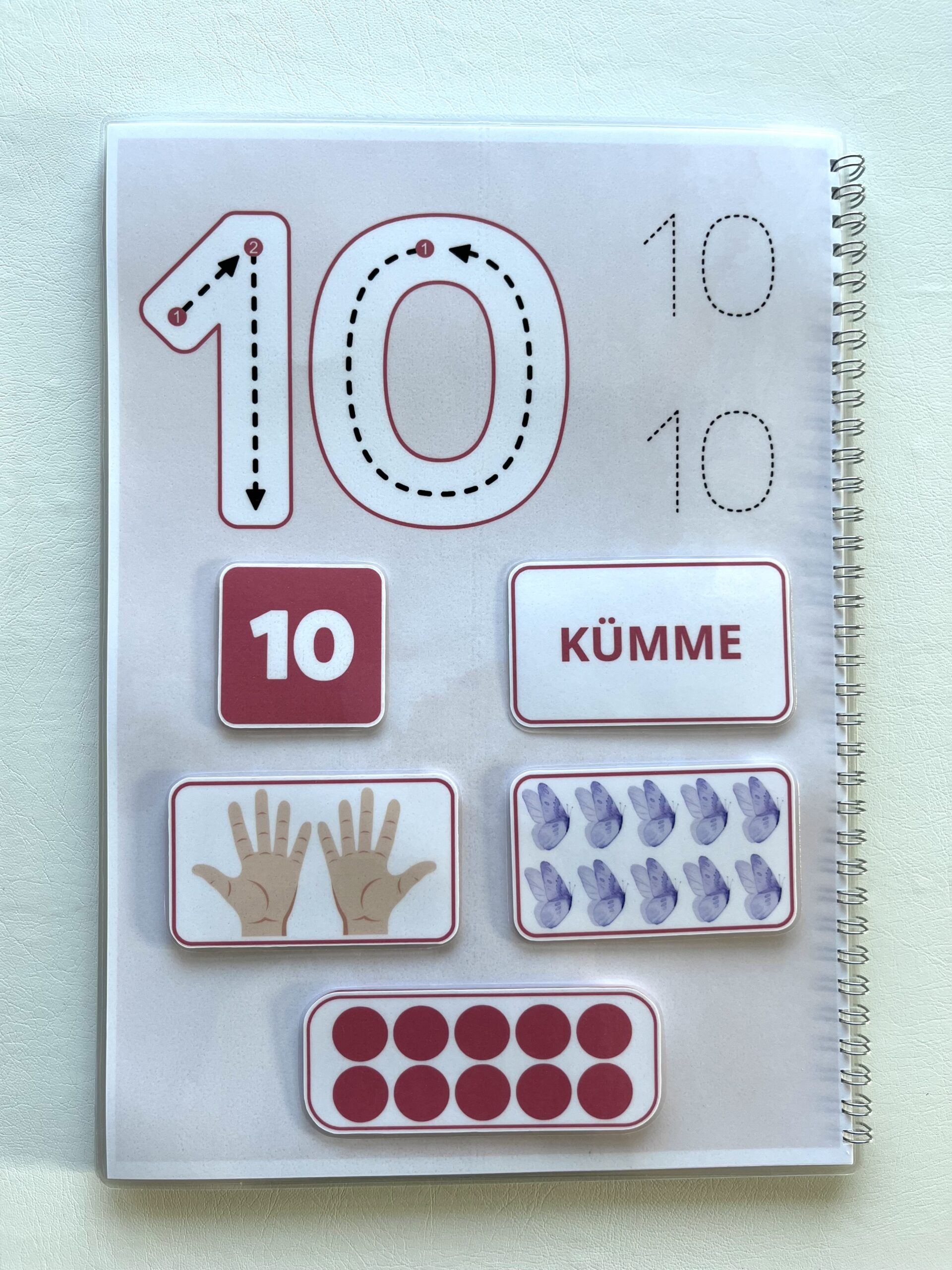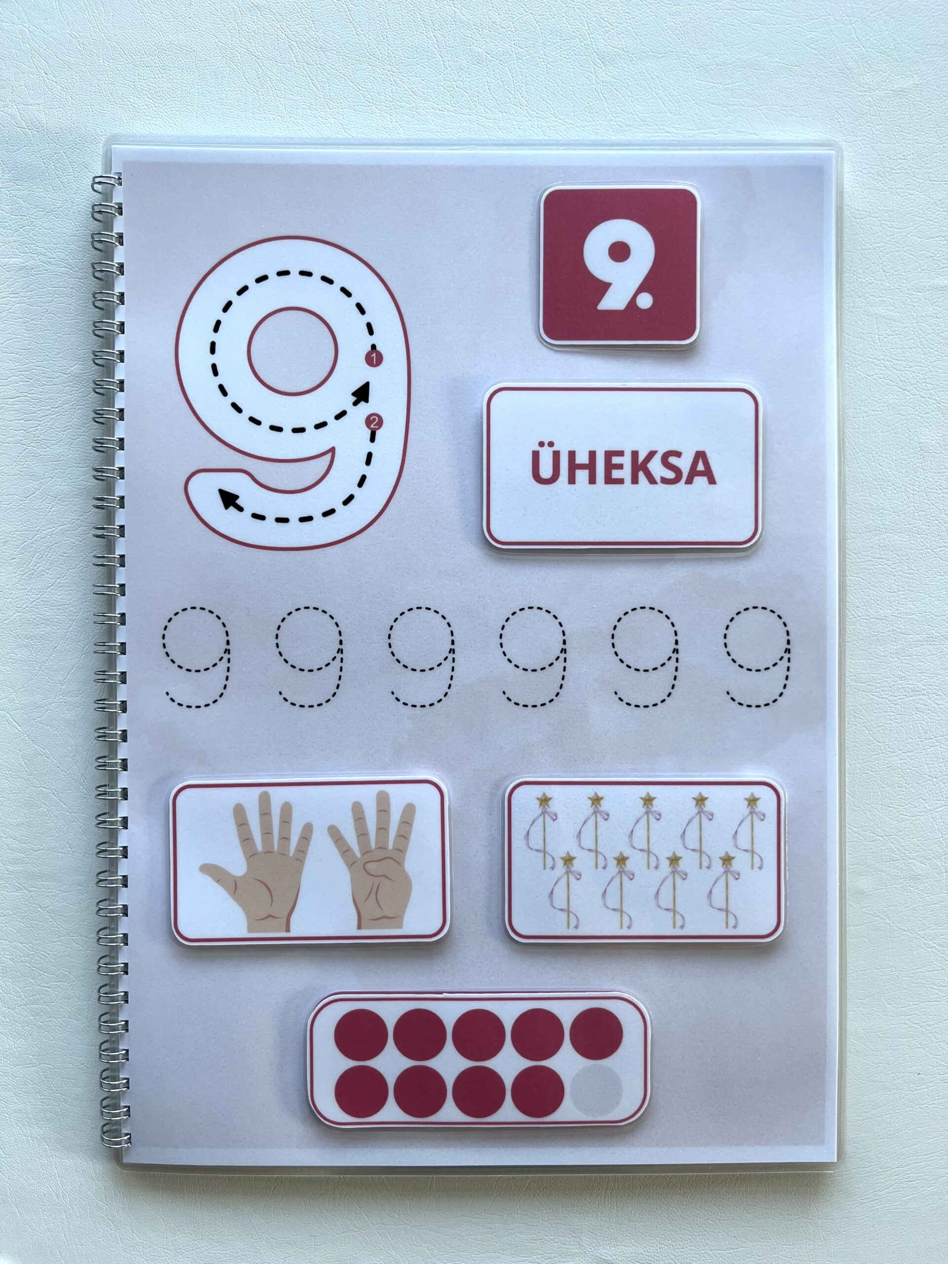 Lisaks saab punktiirjoone abil õppida numbrite kirjutamist kaasasoleva markeriga (markerit saab kergelt kustutada ja taas kasutada).