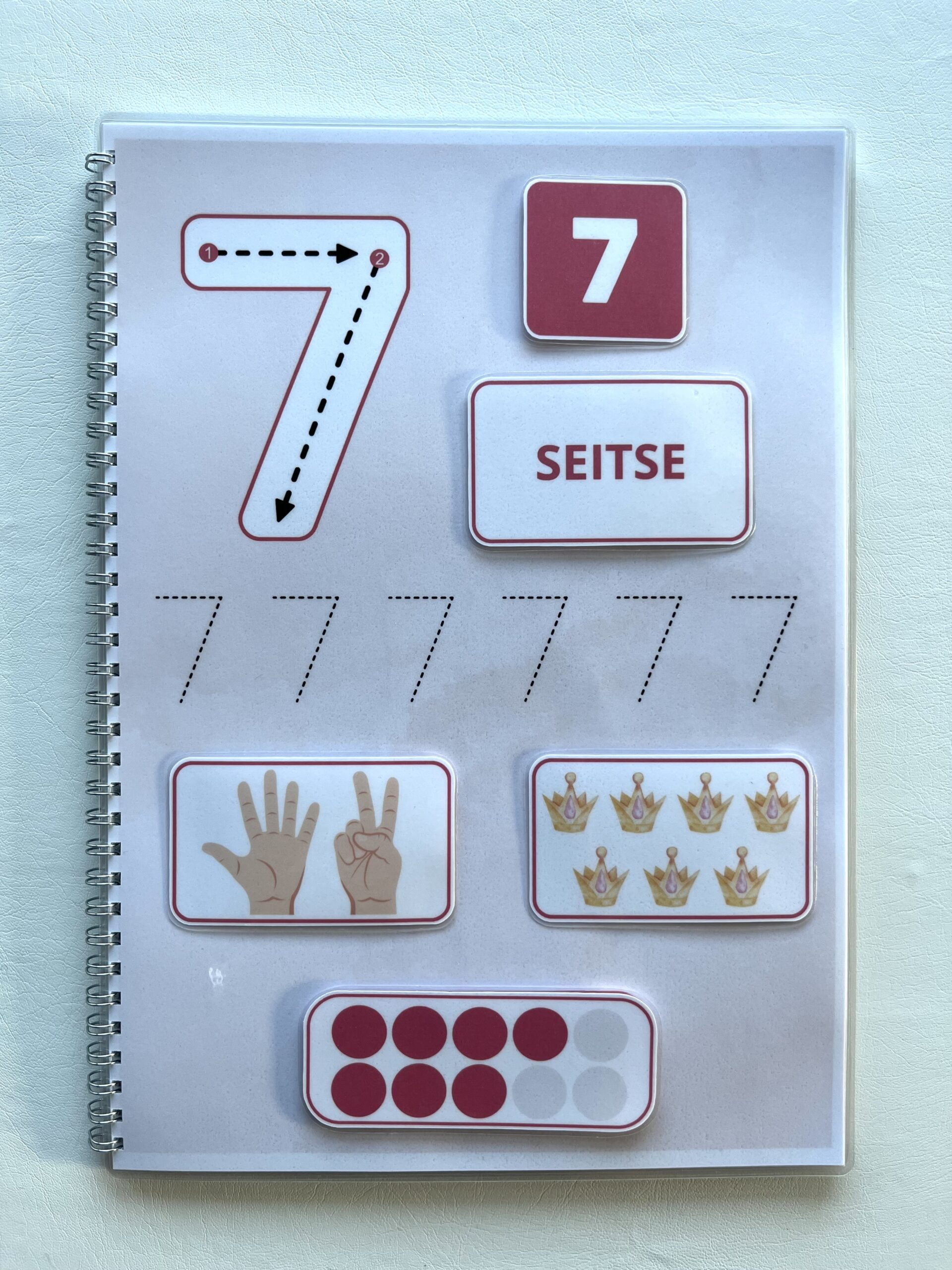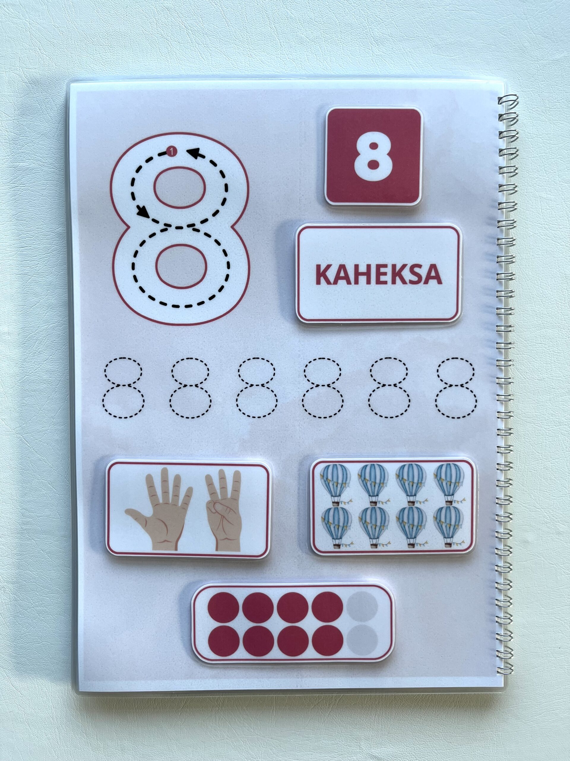 Laps saab pildid kinnitada takjakinnitustega õigete numbrite juurde. Õpib trükitähtedega kirjutatult sõnu, sõrmedelt numbreid lugema või hoopis loendab piltidel olevaid asju.